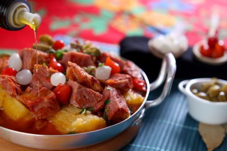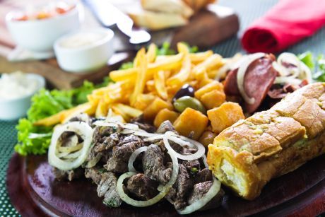 Tábua Kabeça Quente (R$ 54) - Porção de filé mignon acebolado, calabresa acebolada, batata frita, provolone à milanesa e pão de alho acompanhado de maionese temperada, vinagrete, farofa e pão fatiado