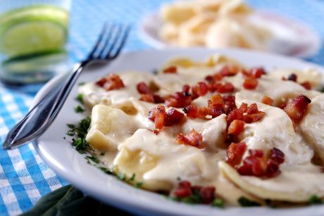 Vertiniai (R$ 24)- Petisco tipo raviole com carne coberto com molho branco salpicado de bacon
