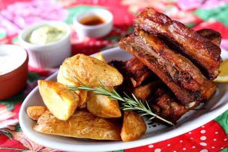 Costelinha de porco com batatas rústicas (R$ 25)- Costelinha de porco servida em uma travessa com as batatas rústicas acompanhada da Maionese de rúcula e farofa
