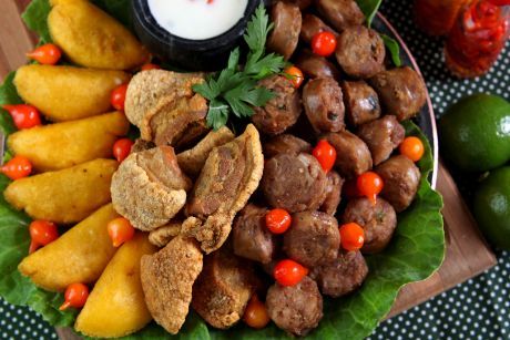 Tresbao demais! (R$ 39) - Linguiça de pernil da vovó Nana acebolada, torresmo crocante, pastel de Angú Carne e Queijo acompanhada de Molho especial