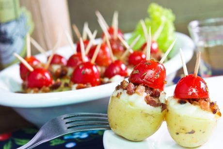 Boné de Corno (R$10) - Batatinha soute, catupiry, bacon em cubos, tomate cereja, sal, azeite e oregano com molho Helmann`s